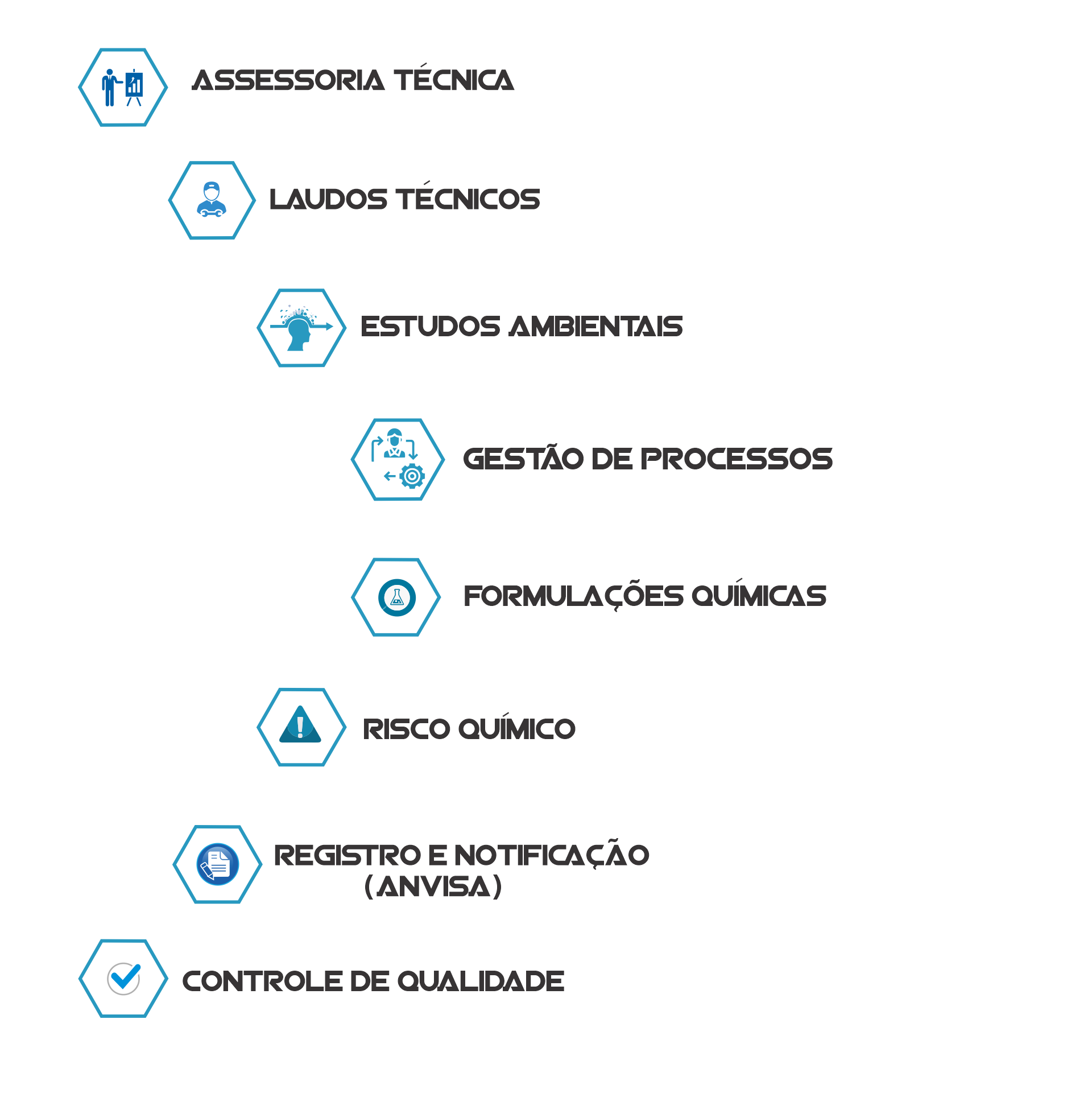 Pesquisas e ensaios de bancada para tratamento de efluentes e águas de processo, resultando em formulações químicas para o uso e reciclo com qualidade aos padrões de consumo e lançamento.